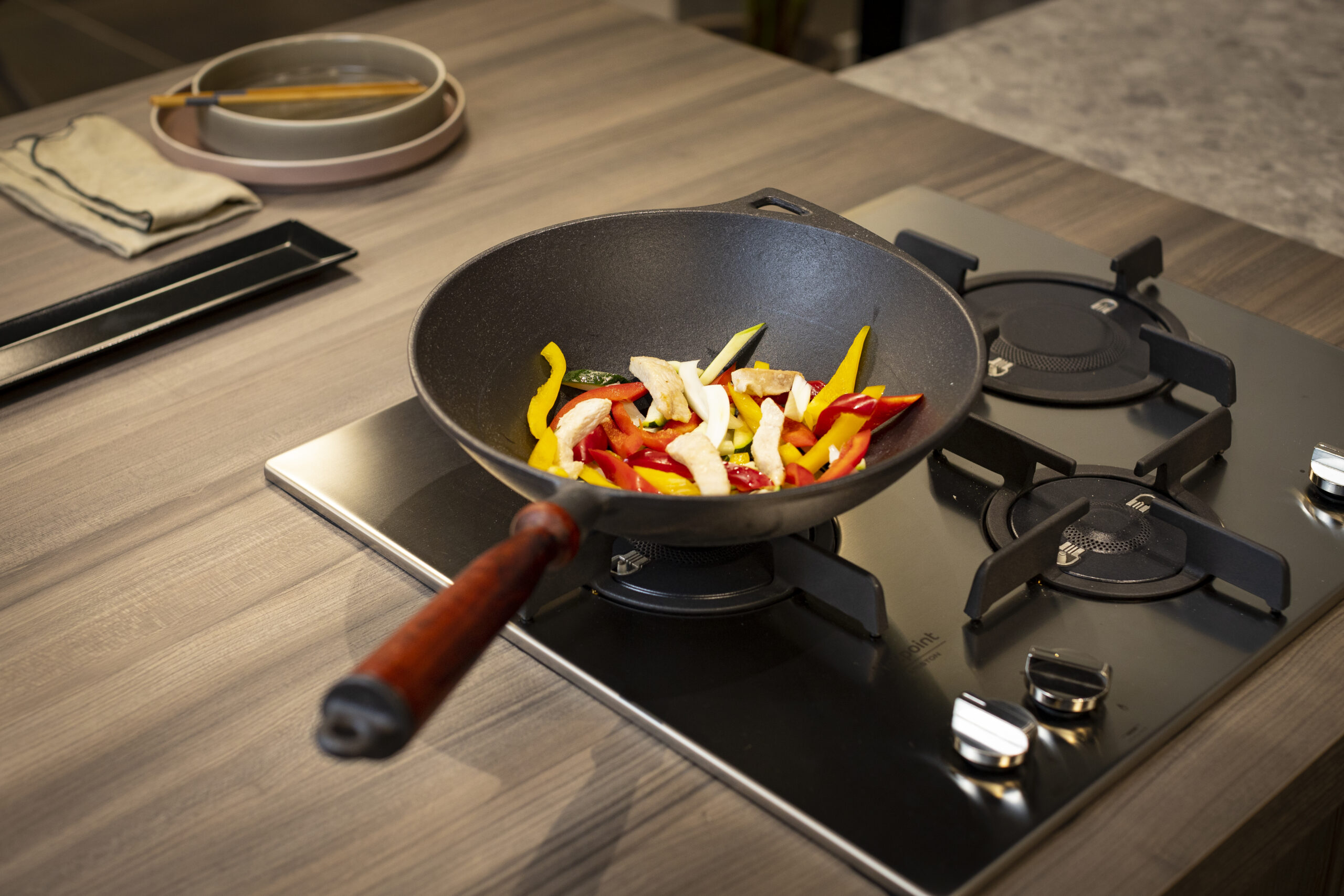 La WOK consente di mantenere a lungo il calore, mentre la sua forma svasata permette di friggere in immersione pur utilizzando scarse dosi di olio, considerando che il punto terminale è a diretto contatto con la fiamma.